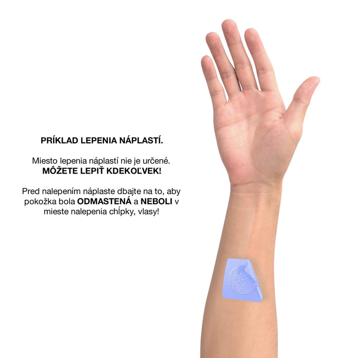 Pred nalepením náplaste dbajte na to, aby pokožka bola odmastená ( dezinfekčný prostriedok , mydlo … ) a neboli v mieste nalepenia chĺpky, vlasy! Nič nemôže brániť priamemu kontaktu náplasť - pokožka!